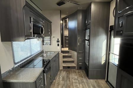 This Toy Hauler is equipped with the amenities needed to explore the great outdoors. Featuring a queen size bed, a pair of Queen bunk beds, and a convertible sofa bed that can accommodate small children comfortably.