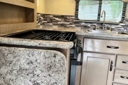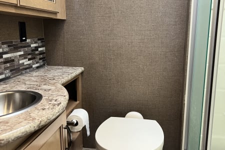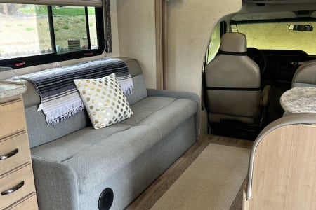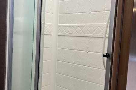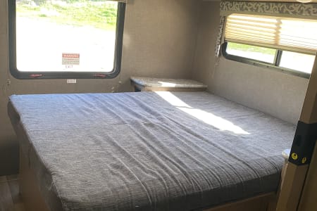 This rig also has stand up shower and toilet in the bathroom, and also an outdoor shower to clean off your pets.