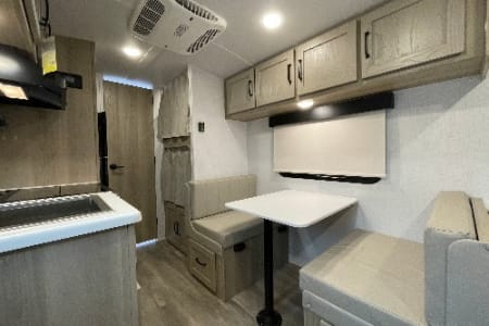 Fun, new family friendly with no need for rv park. Perfect for dry camping. Sleeps 4 to 5... Queen Bed, Bunk beds! Dining area turns into a small size bed for child. Can be pulled by most SUVs and small trucks(min. 3500lb capacity), it's so light 3200lbs!). Tow vehicle must have a hitch with a 2inch receiver, a 7-way plug female. We have a portable break controller as well as a rear camera set up.