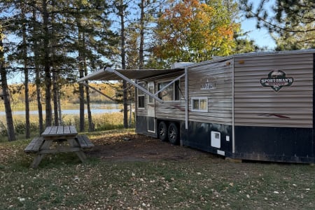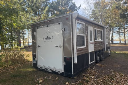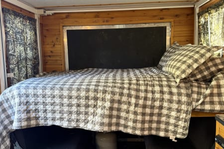 This is a 10 hole fish house. It is perfect for year round camping. There is heat and ac to keep you comfortable in any temperature. It has room to haul toys if desired. There are 3 beds. One bed lifts from the ceiling, one is a futon couch, and the dinette turns into a bed. There is a tv that gets local channels depending on location. There is also a radio with Bluetooth and a spot for CDs. The bathroom can be used year round!