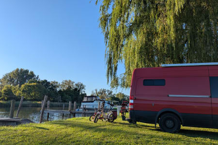 The Rojita Viajera will take you anywhere. You can bring your family or friends with you, up to 4 passengers with additional seating in the back that conveniently folds up to give you more space while parked and enjoying your outdoor adventure! There is one King size bed above with a full-sized mattress below (a perfect hideout/secret club for the kids - our son can attest). If your riding solo or with a single companion that you don't mind (or prefer!) sleeping with, we can remove the mattress and it turns into additional storage. Perfect for your inflatable kayaks or as we more accurately use them, "river pool floats" *grin*. A sliding door separates the lower bed nook from the rest of the van to offer more privacy.