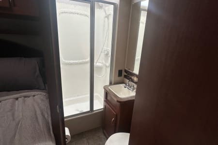 Large bathroom with shower, A/C, generator, TV, outdoor carpet, electric awning, propane BBQ, outdoor table, and four folding chairs!