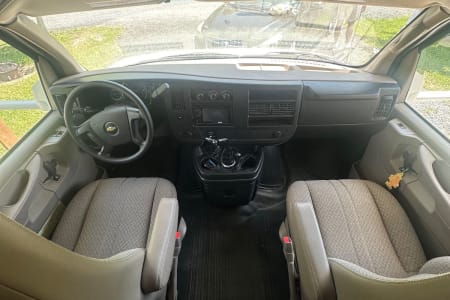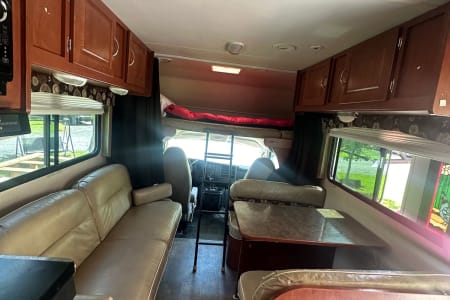 The RV can accommodate 6 people. It offers a twin size bed in the back, a twin size bed in the front plus the couch and the table converts into a bed.