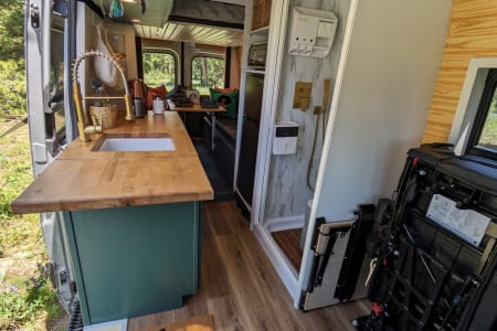 Seatbelts for 4, sleeping for 4! Electronic bed lift, air conditioning, heater, 2 rooftop fans. Indoor shower and 2 outdoor showers. Upgraded 40 gallon fresh water tank and 17 gallon grey water tank. Full wet bath with cassette toilet! Dimmable interior lights, induction cooktop, pull out exterior table!