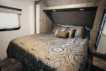2 Slide Outs. Queen size bed in the front, private bunkhouse room in the back with 2 bunk beds and a convertible dining table bed, and both the couch and dinette in living room convert into beds as well! Outdoor kitchen with sink, refrigerator, and range. Electric awning.