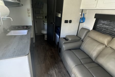 This camper is so lightweight and easy to pull with close to any vehicle (but we can also deliver with an additional fee). She’s fully loaded so bring your clothes, food & toiletries and let the camper do the rest! Cold? We have heat and provide an electric heater and tons of extra blankets! Hot? We have ice cold AC and a fridge to keep those beverages of choice extra cold! Stinky? Fix that in the shower! Sleepy? Enjoy a snooze in one of our bed options that are fully supplied with linens! Hungry? Make yourself a meal in our fully equipped kitchen! Bored? Kick back in our leather recliner that lays almost flat and stick a movie in the dvd system that’s built into the tv and relax! Feeling outdoorsy? Kick back under the awning outside!