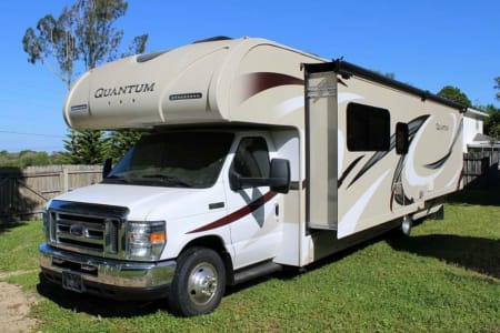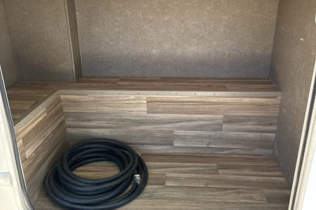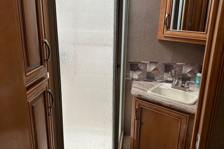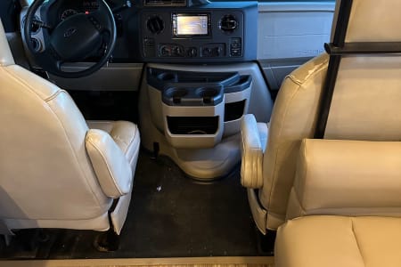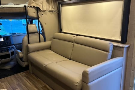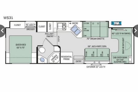 The Holy Moly Mobile provides plenty of space with a full wall slide out from dining table to bedroom. There is a jack knife sofa to your immediate right and a queen sized cab over bunk in the front as an additional sleeping area. There is a 40 inch LED TV that swivels for multiple viewing locations throughout the coach. A dream dinette which includes two seatbelts and the jack knife sofa with an additional three seatbelts to provide a safe ride for you and your guest. To the rear of the coach you will find a private restroom and shower in addition to the quien sized bedroom with plenty of storage.