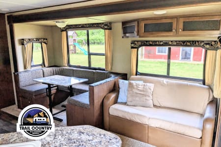 This spacious 35' camper has everything you need and want! Stereo, Bluetooth, CD, DVD, TV, surround sound and outdoor speakers!!