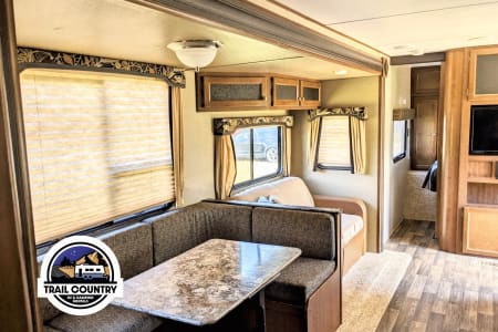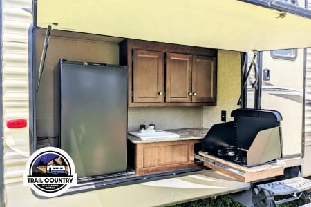 Two slide outs, two bedrooms, a stocked kitchen, and dining, and seating areas. Step outside to enjoy the outdoor kitchen and awning while you relax in the provided camp chairs.