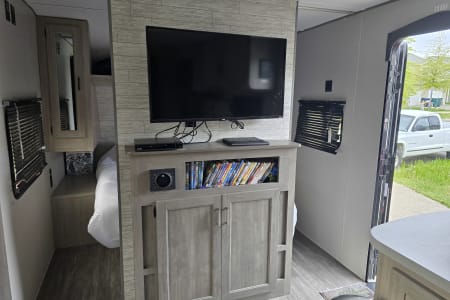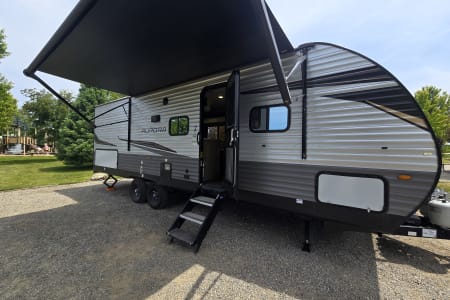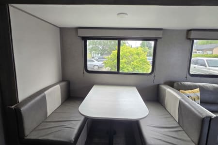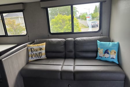 Everyone will have a comfortable time camping in this travel trailer! It features a set of double sized bunk beds for the kids or guests to sleep on and are conveniently next to the rear corner bathroom which has a tub/shower with a skylight above for added natural lighting. The booth dinette and sofa slide opens up the kitchen area so you have more space to prepare your best meals with the three burner cooktop. When you're ready to wind down your nights, grab a snack from the large pantry, a beverage from the 10.7 cu. ft. refrigerator, and place your drink in the cupholder/arm rest of the sofa while you sit and relax