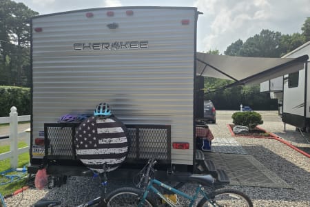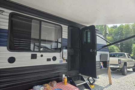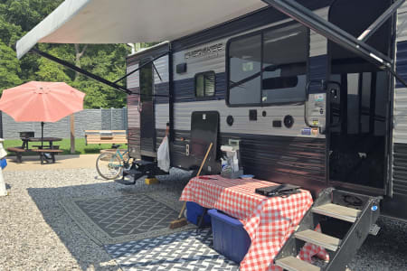 2021 Forest River Grey Wolf camper trailer. 2 doors for entry. Full bathroom and kitchen. Sleeps 8. Leather pull out couch, dinette that converts to double bed, TV with DVD player, Bluetooth radio indoor and outdoor, one slide out, bunk beds and private room with queen bed in the back. Electric retractable awning, outdoor propane grill/refrigerator/icemaker area. Electric fireplace, heat and air conditioning. Outdoor pet leash hook.