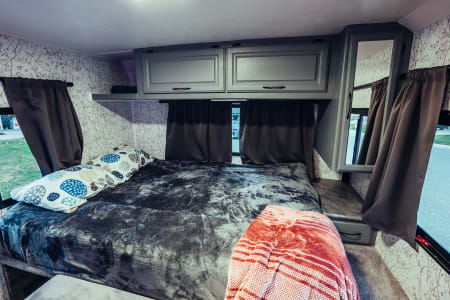 RV has 2 queen beds with mattress toppers for extra comfort. 1 queen bed is located over the cab and the other queen bed is in the master bedroom area and the sofa also folds out to a full size bed. The dinette has custom countertop, so it does not turns into a twin size bed. Bedding, pillows and blankets are included for all beds. Our RV sleeps up to 6 people comfortable.