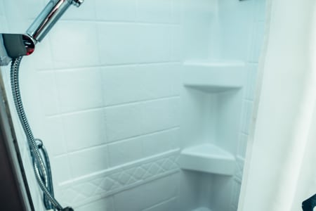 The bathroom is supplied with hand soap, hand sanitizer, holding tanks deodorizer, gloves, cleaning supplies, and RV toilet paper.
