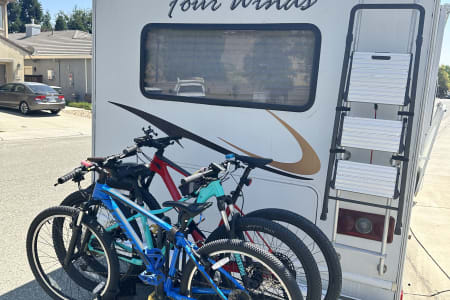 The RV has lots of storage inside and out. Particularity the main outside storage is large enough to fit paddle boards, camping stuff and other things. Also the bike hitch can be added, so you can take your bike with you on the road trip.