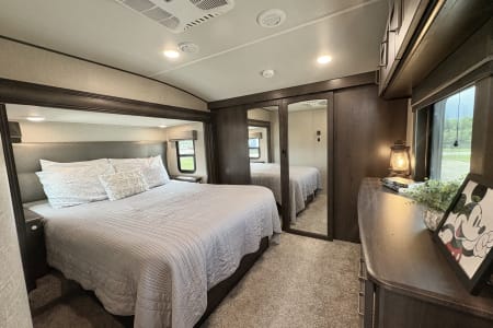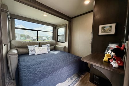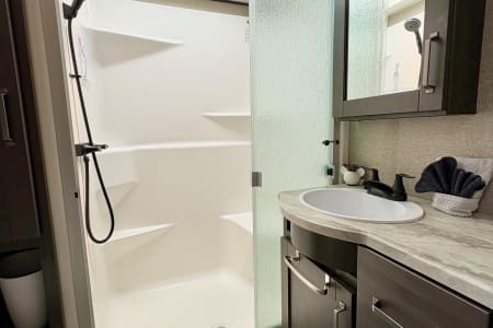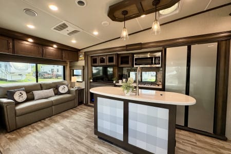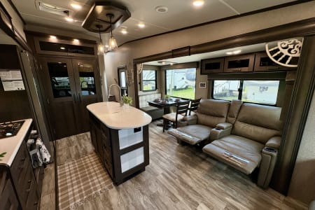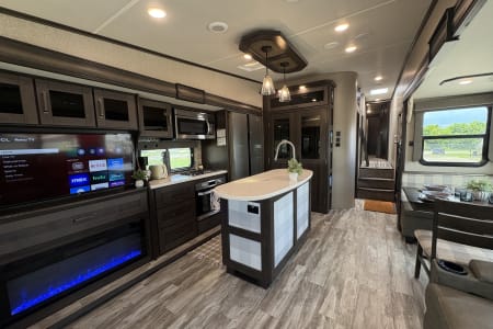 This unit is a gorgeous fifth wheel! The master has a queen bed and plenty of storage! There is 1 full bathroom with a toilet, sink and shower. The kitchen comes full stocked with all of your cooking basics with an island sink, stove/oven, microwave and a refrigerator. The living room has theatre seats, a sofa couch that converts into a bed, TV and a fireplace. There is a separate "office/living room' that has another fold out sofa couch and a loft above that. There are two awnings on the outside of the unit and a outside mini fridge as well!