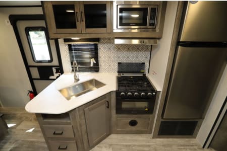 This 2021 Heartland North Trail camper is fully loaded with plenty of space for the whole family! It has a king-size bed in the front. The kitchenette table converts to a full-size bed along with bunk beds that are full-size mattresses. It has an indoor/outdoor stereo system with Bluetooth capabilities. The indoor kitchen has a stove, range, and fridge. It has an outdoor kitchen too, with sink, range and mini fridge! Full indoor bathroom and outdoor shower. One slide for extra living space and lots of storage available. Camper is fully stocked including bedding, towels, pots and pans, basic cooking utensils, plates, cups, silverware, coffee maker, toaster, basic cleaning supplies, TV and DVD player. We are a family and pet friendly camper and offer lots of fun add-ons, like pack and plays for little campers, generators for boondocking, pet items for your furry friends, and games for kids--or adults :)