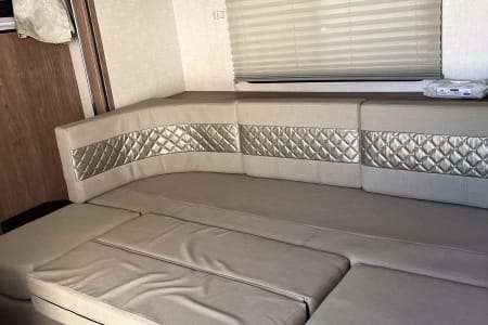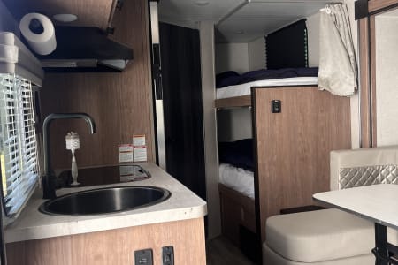 - Sleeps up to 5 people (6 if you have 4 kids and 2 adults) with a comfortable queen-sized bed ( my 6’2 husband can stretch all the way out), twin over twin bunk bed, and convertible sofa/dinette bed