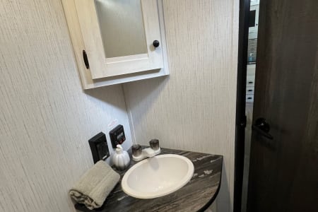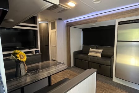 The Trail Runner is both spacious and cozy, featuring a generous living area that allows for easy movement. It includes a comfortable 10-inch queen-size mattress and a large screen TV with Wi-Fi capabilities. Two bunk beds tuck away neatly, providing additional sleeping space. The bathroom comes with a shower and a mini tub, while the camper is equipped with a nicely sized refrigerator.