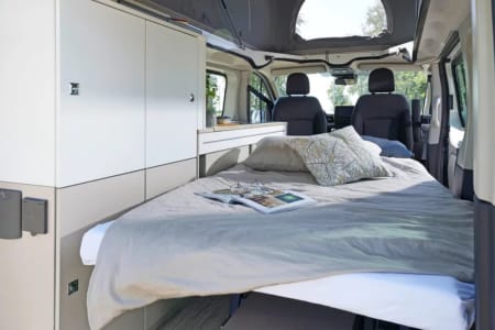La nuit, la banquette arrière se convertit en un deuxième couchage double, afin de pouvoir dormir jusqu’à 4 personnes.
