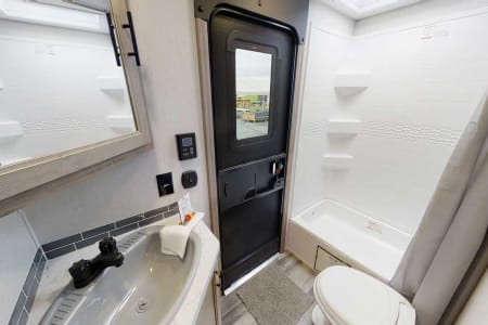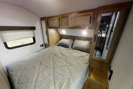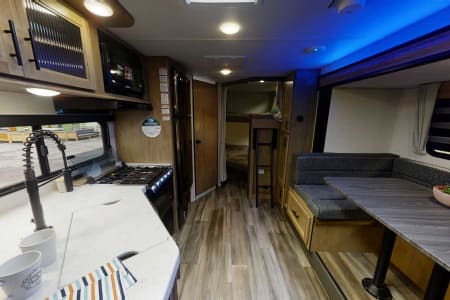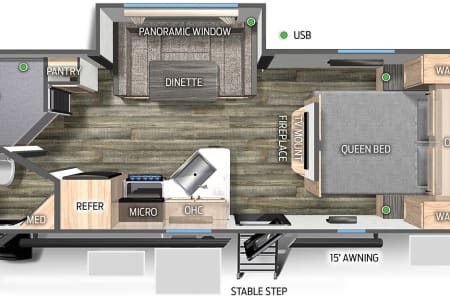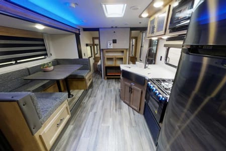26' bunkhouse with dinette slideout featuring a huge double bunk with ladder for kids. The double entry doors with easy access to the bathroom and kitchen from outside. Modern kitchen, oversized pantry, and extra-large U-shaped dinette with full length drawers give plenty of storage. Private master suite with memory foam queen bed. Also includes these features: