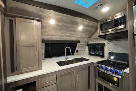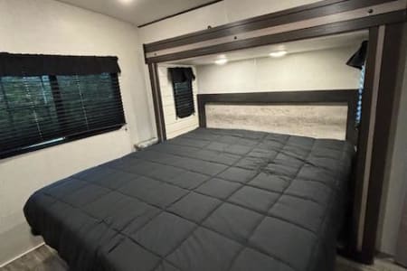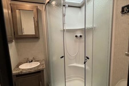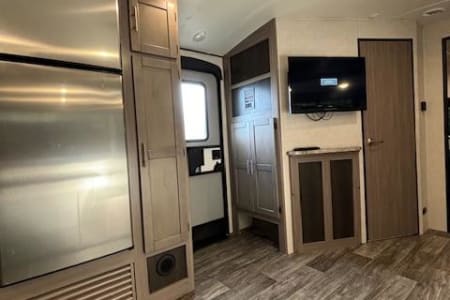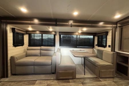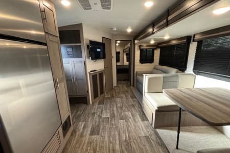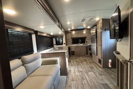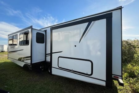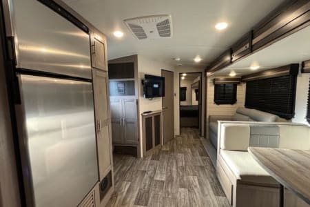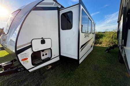 You will love this RV. It has everything you need and then some. The Sunset trail is 30' 11" long with two slides and weighs 5980 lbs. Sleeps 4 to 6 depending on size. Two large solar panels on the roof power a inverter that will give you some a/c power when you are dry camping. You will have everything but air conditioning and microwave. It has a full kitchen up front with plenty of counter space, large frig and freezer. 3 burner stove, large sink, and microwave. There are plenty cabinets, drawers, and outlets for appliances. Eat your meals at your bench seat dinette that can go down to a bed. Next to the dinette is a couch that can make a bed. Across from the couch is a 32" TV with AM, FM radio. Going toward the back is a full bathroom with a large shower, toilet, vanity with sink and medicine chest, and linen closet. Best of all is the rear bedroom with a slide. You have a King size Walk around bed with two huge hanging cloths closets and drawers for storage. Outside You have a electric awning with LED Lights, outside storage, and electric tongue jack. There are two Large Solar Panels on the roof that go to a inverter that produces enough A/C power to run the frig., TV, and Electric TV antenna. All this is ready to go on your next adventure.