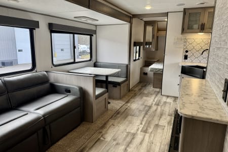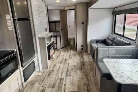 Hit the road in style with this spacious and modern travel trailer, designed for unforgettable family getaways and group adventures. With room for up to 8 guests, it features double-over-double bunks, a private queen bed, and a convertible dinette—offering plenty of cozy sleeping space for everyone. Plus, there’s extra pantry and storage space to keep all your essentials organized.