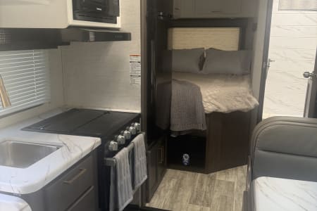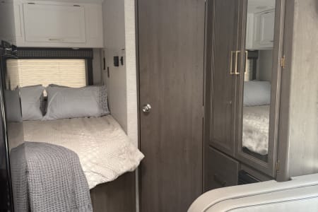 If you wish to escape the hustle and bustle of everyday life with your favorite people then check out this motorhome! Everyone will have a comfortable place to sleep between the rear corner 54x80 inch queen bed, the 52x96 inch bunk over cab with a 40 inch TV on a swivel for entertainment at night, and even the 76 inch Dream Dinette can transform into an extra sleeping space. Store all of your essentials in the closet just outside the rear corner bathroom which has a 24 x 36 inch shower and keep your perishables fresh in the refrigerator. The flip-up countertop extension makes it easier to prepare your home cooked meals.