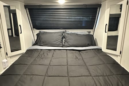 The spacious queen bed runs north and south. Climb in and out of bed on each side (no climbing over your partner to get out of bed), and dinette turns into a single bed (all bedding, pillows, and extra blankets included).