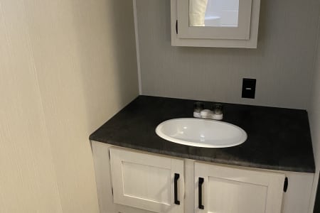 Camper has full bathroom, toilet, shower, sink, medicine cabinet, sky light, towels, hand soap and toilet paper provided.