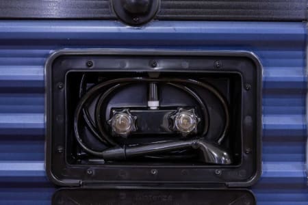 Exterior...large awning, outdoor mat to help keep dirt out of camper, outdoor speakers, 110v outlets, and outdoor shower.