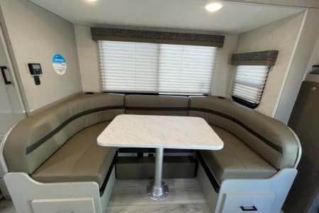 Relax by the electric fireplace in the evenings, or swivel the captain’s chairs for added seating around the spacious