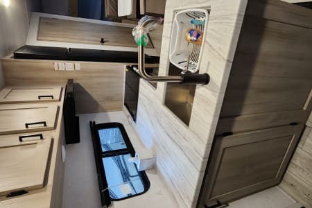 Super easy to set up, with 1 slide. Convenient features like lighted awnings, motion sense lighting, nice cook top, and on demand hot water!