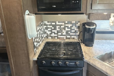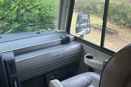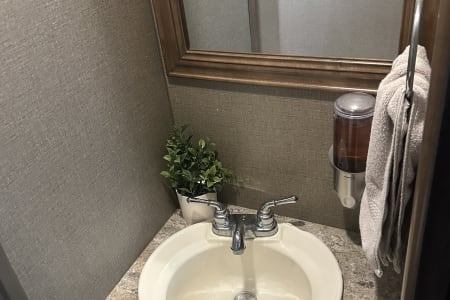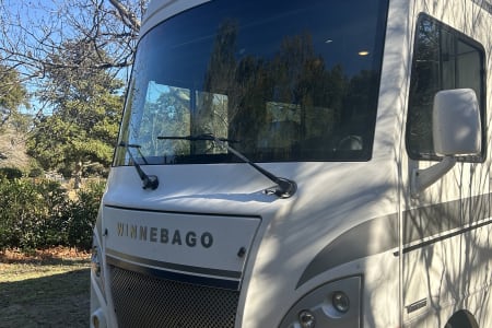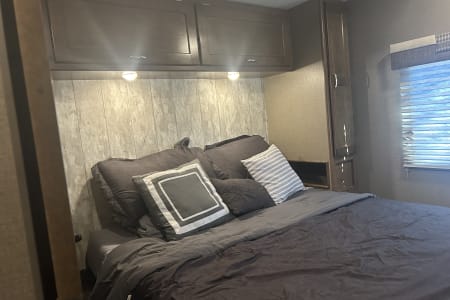 This 31 foot class A is perfect for groups or families traveling with children. There are 2 bunk beds that go along with a bunk over the driver compartment along with a dinner table and couch that fold down into more sleeping area. The main bedroom features a queen size bed, along with a 32” flat screen tv and ample storage space. The bathroom has a walk in shower along with sink and toilet. The living room area features a fridge and freezer along with stove and oven top. There is a microwave and double kitchen sink as well. There is 40” flat screen tv in this area. Outside you can lounge underneath the large awning and enjoy a meal with the outdoor dining area. There is a mini fridge along with a sink outside.
