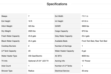 This camper is a expandable camper which means it is small making it easy for towing and more fuel efficient. Both ends fold out very easily into queen beds. Much better than a popup (or tent) but without the boat anchor of a full camper.