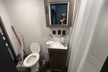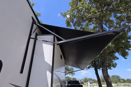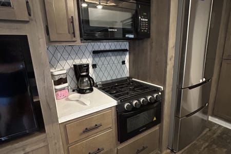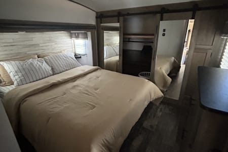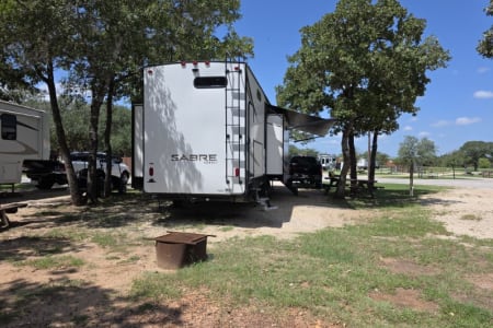 Our family has enjoyed camping for many years. This fifth wheel has elevated our camping experience. We want your experience to be the same or better! You will find the camper warm and inviting with tons of storage. There are two bathrooms. YES! we said two. There is a tub with a shower in the rear of the camper with inside and outside access. There is a large shower in the front bathroom. The bunk room includes a fold down bunk, a fold out sofa, two upper bunks, and a television with WiFi accessibility. The main living area includes a reclining sofa, a dinette for 4, an island sink with storage, a residential refrigerator, microwave, oven with cooktop, large flat screen tv, a fireplace, and cabinets galore! The front bedroom has a queen bed, dresser, and a large closet. The slide-outs make the interior of the camper feel spacious with room to add chairs for guests. The exterior of the camper includes a full-size awning, storage for chairs, fishing poles, etc. and there is an outdoor kitchen that includes a sink, cabinet storage, and a mini-frig. We handle the setup and the hookup so when you arrive you just add your personal items and relax!