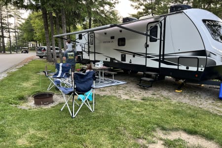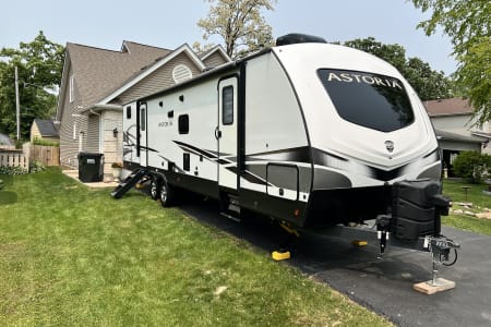 Master bedroom RV King sized bed with upgraded 10 inch memory foam mattress, Projector (cellular wifi hotspot needed for use), large shower with ample head clearance. Interior/exterior speaker with Bluetooth connection, Roku TV in living area, electric fireplace, theatre seating, foldable kitchen table for additional sleeping area. Ample storage throughout. Farmhouse charm look with grey and white tones, gold/brass accents.