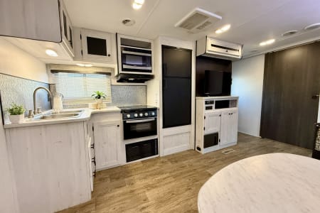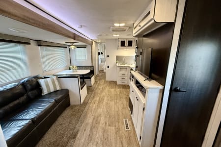 The 2021 Heartland Trail Runner 31DB is a spacious and well-equipped travel trailer perfect for families or groups looking for an adventure. It features a separate master bedroom with a queen-sized bed and a large rear bunkhouse for the kids or additional guests. The trailer offers a fully functional kitchen with a fridge, stove, microwave, and plenty of counter space. The living area has a comfortable sofa and dinette for relaxing or meals, and the bathroom includes a shower, toilet, and sink. Outside, you'll find an electric awning for shade, plus ample storage compartments for your gear. With its easy-to-tow design and family-friendly layout, it’s a great choice for making lasting memories on the road!