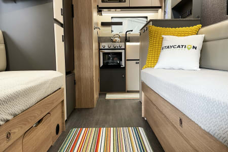 Skye is our Excel 620S from Auto-Trail. A new model for 2025, Syke offers a luxury 2 Berth for those wanting ultimate comfort and style. Skye has 2 captains seats leading on to 2 long bench seats which can be used as either 2 single beds or be converted into a huge double bed. At the rear there is a great kitchen space and large washroom with separate shower.