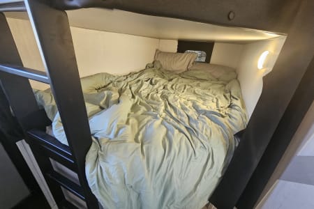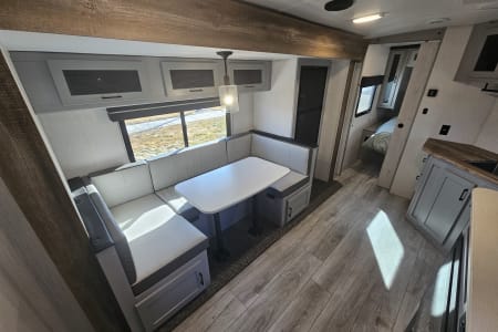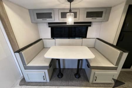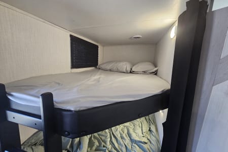 We invite your family and friends along to the great outdoors in this travel trailer that can sleep eight people each night! The double-size bunks are sure to be a hit and the full bath is right next to the bunks for convenience. Enjoy game night around the U-shaped dinette within the slide out, or relax under the 18' power awning while supper cooks on the inside or outside kitchen with gas ranges. Our camper includes a front private bedroom with a king bed that will feel just like home!