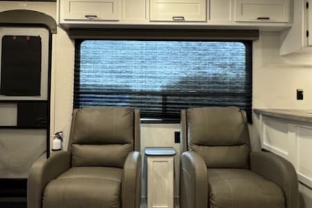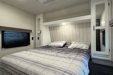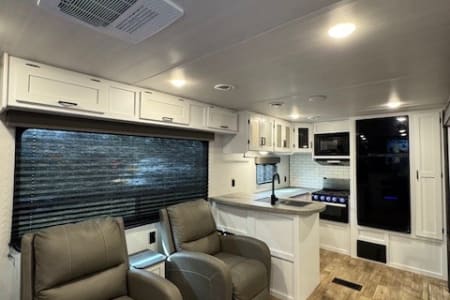The Keystone hideout is great for any occasion. Weighs 7012 lbs., sleeps 4, electric tongue jack, electric stabilizer jacks, 32’11” long, electric awning, outside cook station, 2 A/C, Solar on top, and outside shower. Walk in the front door and you are in the living area, with sofa, two recliners, 40” TV, fake fireplace with heat, and Central vac system. Go toward the back and you are in the kitchen area with 3-burner stove, microwave, large frig. & freezer, large sink, and plenty of cabinets for storage. The main bedroom is in the front with a Queen walk around bed with a closet on each side. Between the living area and the bedroom is a full bathroom with a large shower, vanity with a sink mirror and a toilet.