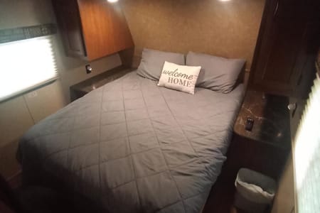 In the front bedroom, you will find a queen bed with wardrobes on either side of the bed and a shelf above the bed.