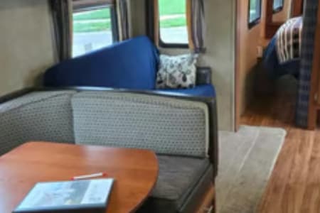 To the left of the entrance, you will find a double kitchen sink, three burner range, microwave, and refrigerator. The opposite side of the travel trailer offers a slide with a sofa and a u-dinette slide. Next to the dinette there is a nice size pantry.