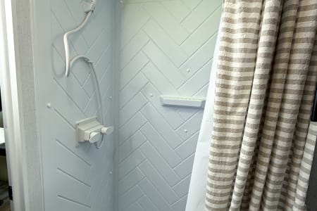 Modern Bathroom: Full bathroom with a shower to freshen up after a day at the event center.
