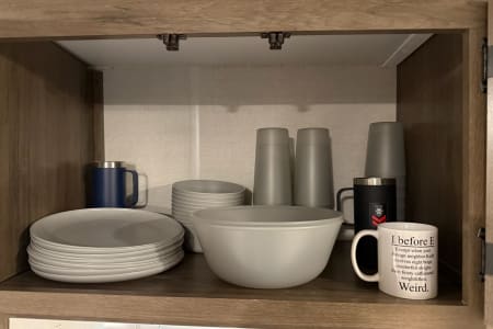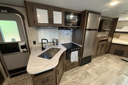 Across from the pop-out is an incredible kitchen with a large refrigerator, oven, stove, and microwave. Basic cleaning supplies and dishes/flatware are included.
