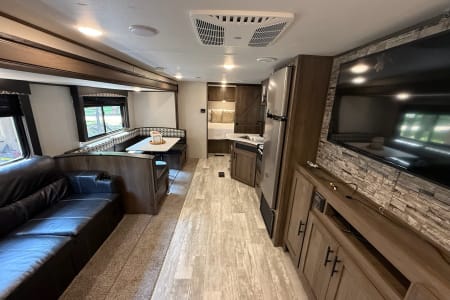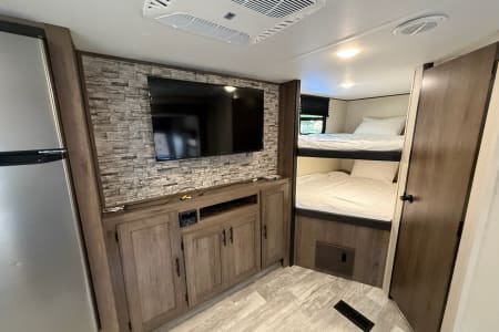 Next to the kitchen, you'll find lots of storage that we use for the pantry and kids'/other guests' storage and a beautiful space with a television that’s pre-wired for cable if access is provided at your campground. There's also a blu-ray player provided.