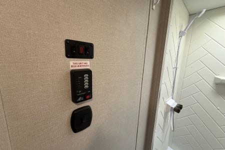 On the exterior in the back is the 30 amp plug with outdoor shower and cable access.