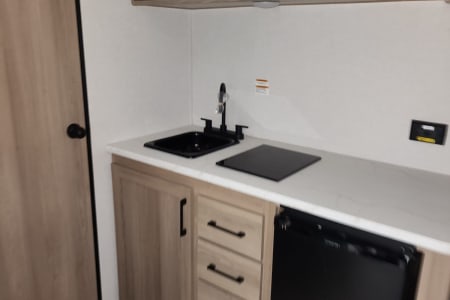 Kitchen Includes: Single Burner INDUCTION Cooktop (No Propane), Microwave, Sink and All cooking essentials including Induction Cookware