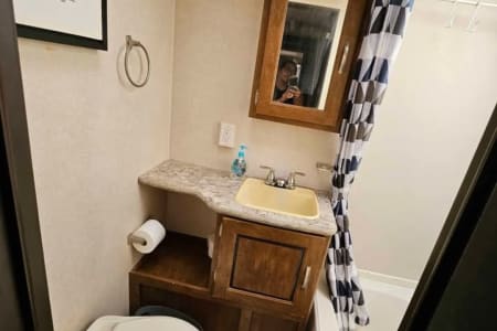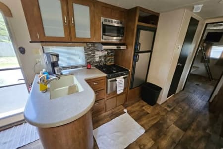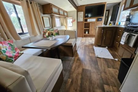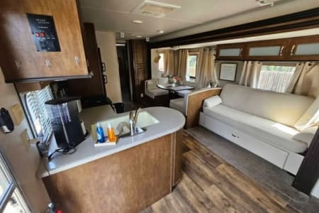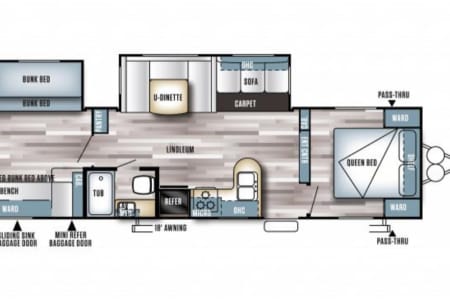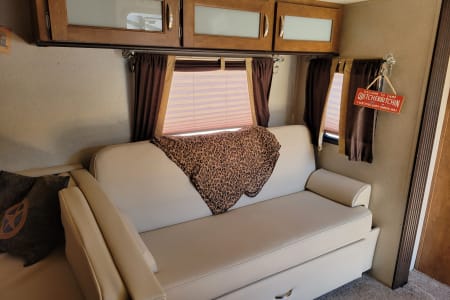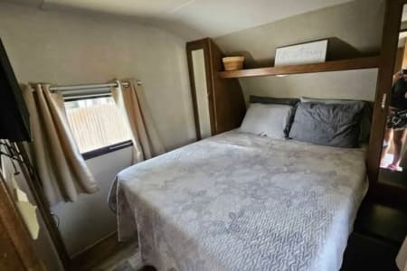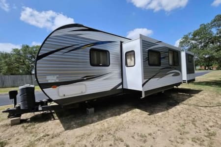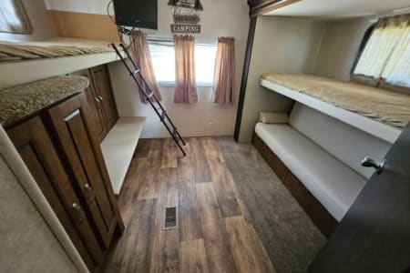 Bunkhouse RV that can sleep up to 10 people in the right circumstances. There are 2 pull out couches, a conversion dining table, 2 full size beds and a queen master bedroom, enough room to sleep everyone. This RV has an outside refrigerator and sink. There are 4 speakers on the inside and 2 on the outside to keep the music going. So much storage that you will have to write down where you out things. This RV has everything you need to make memories for you and your family.