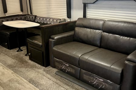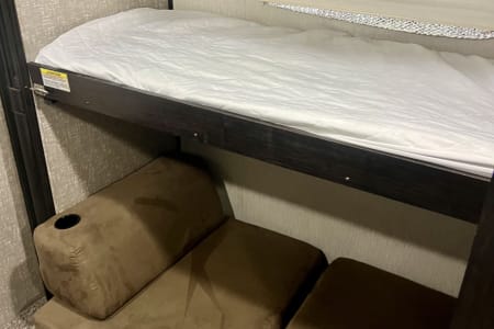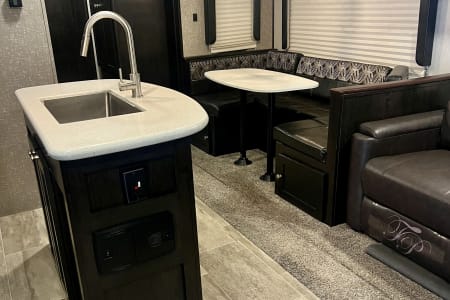 This 2019 RV is very clean and in great shape. The layout is spacious and excellent for a large family. The master room has a queen size bed with a new luxury cool breeze mattress. The couch in the living area is new and pulls out into a double bed. The rear separate bedroom has two twin bunks and a pullout sofa Sleeping a total of four. The kitchen has a large dinette that goes into a bed as well. Total RV can sleep up to 8 to 10. With our Texas heat, you will be happy to know there are two a/C units! Guaranteed to keep you cool on those hot summer nights. There is a big island in the kitchen with a double sink, microwave, gas, stove, top and oven. Plenty of storage With a pantry. Wall cabinets and extra storage under the master bed. Refridge/freezer runs off electric and propane so your perishable stay cold even while traveling. Kitchen is stocked with coffee, pot, toaster all cooking and eating utensils, plates, cups, coffee, mugs, pots, pans, toilet paper, and paper towel towels. Entertainment options include TV, DVD player, stereo with Bluetooth that play speakers on interior and exterior. The bathroom has its own second entry door to the outside. It also has a shower and tub. Outdoor kitchen has its own sink, TV, storage with grilling utensils and plenty of countertop to prep your meals.