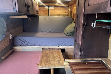 Snowflake is our home made Log Cabin on wheels Sprinter Van. Snowflake is designed to be completely off grid, giving you the freedom to take the comfort of a rustic log cabin wherever the road takes you. The vans interior runs entirely on solar, with a backup plug in really only necessary in the heart of winter. Take this van wherever and be fully self sustainable with a full kitchen, 4 outlets to charge your devices, and adjustable LED lights all running on Solar power! A sectional queen sized bed gives you plenty of space at night while allowing plenty of space to hangout in the van if the weather is bad.